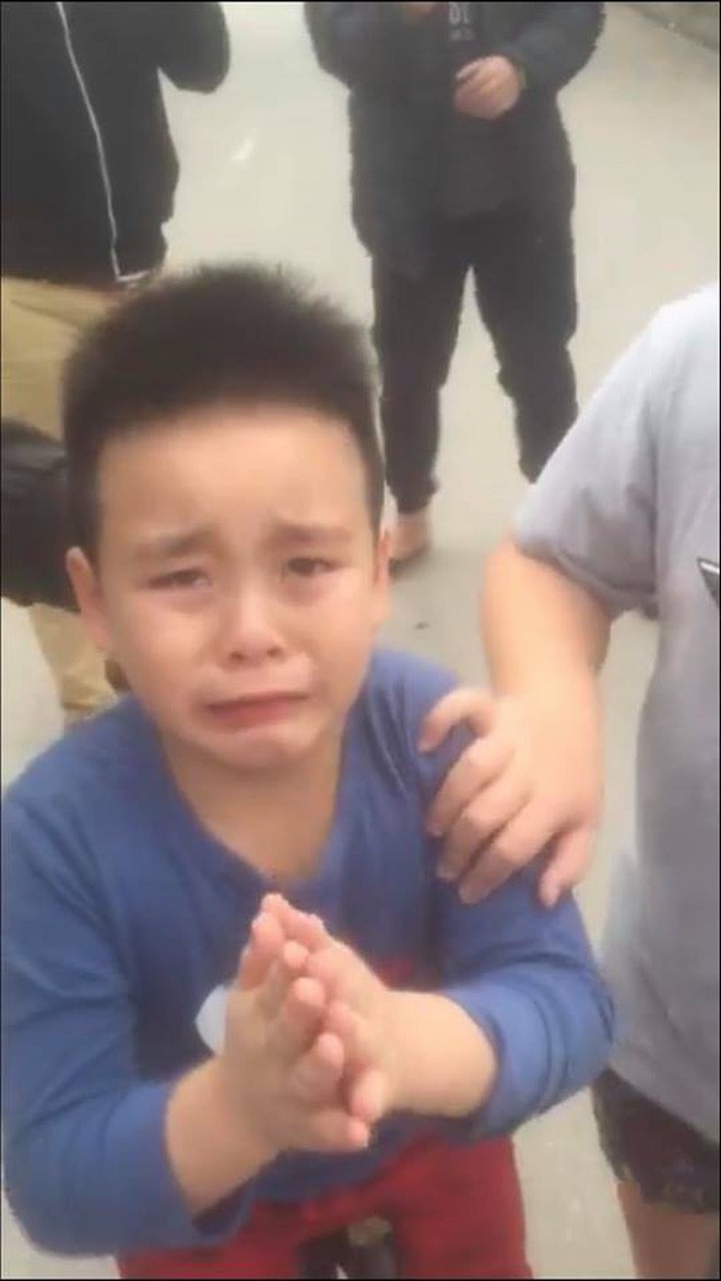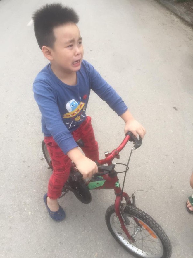 Còn chưa kịp buồn vì chiếc ô tô bị hư hại, khổ chủ lại phải phá lên cười khi nhìn sang "thủ phạm" nhỏ tuổi đang đứng khóc như mưa bên chiếc xe đạp, miệng liên tục "con xin lỗi chú"!