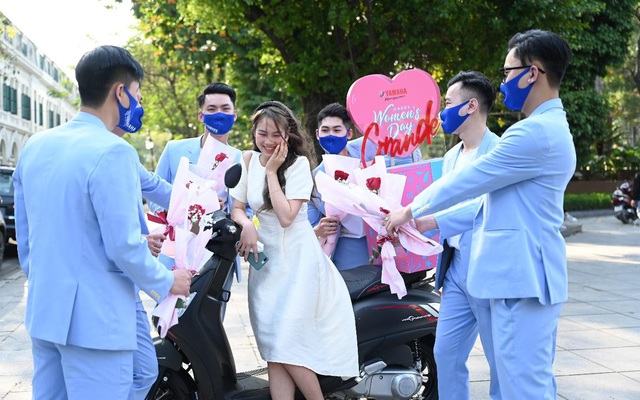 Xuất phát từ 7h sáng và kết thúc lúc 9h tối ngày 8-3, các chàng trai Yamaha trong bộ suit lịch lãm cùng người bạn đồng hành Yamaha Grande đã trải qua quãng đường gần 100km để mang tới hàng trăm bông hoa hồng dành tặng phái đẹp.